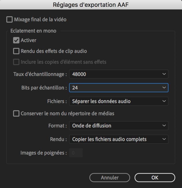 Si cela ne change pas grand chose pour le montage, ce réglage est essentiel pour la suite de la post-production. En effet, les fichiers stéréos non-éclatés sont actuellement mal interprétés par Pro Tools, et ne seront pas reconnus à l’ouverture de l’AAF. Choisir l’option « Mono » permet d’éviter cet écueil.