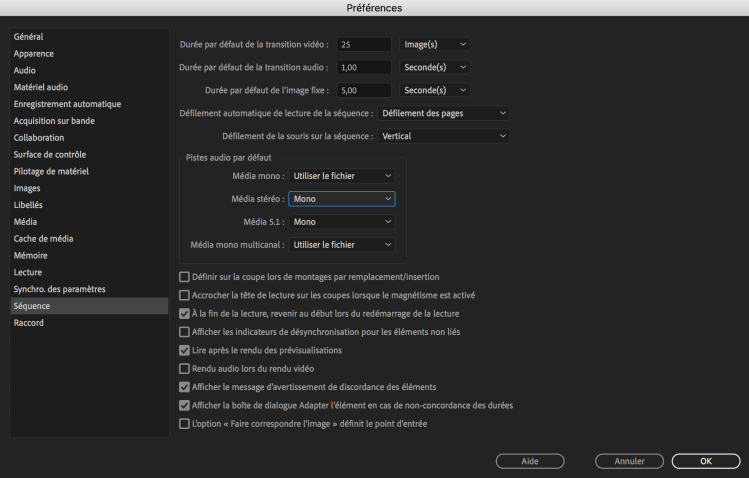 Avant d’importer vos fichiers audio, il est essentiel de modifier certains réglages par défaut de Premiere Pro. Ouvrez la fenêtre des Préférences, et choisissez l’onglet « Séquence ».