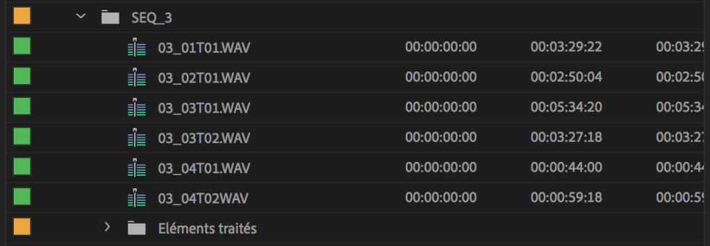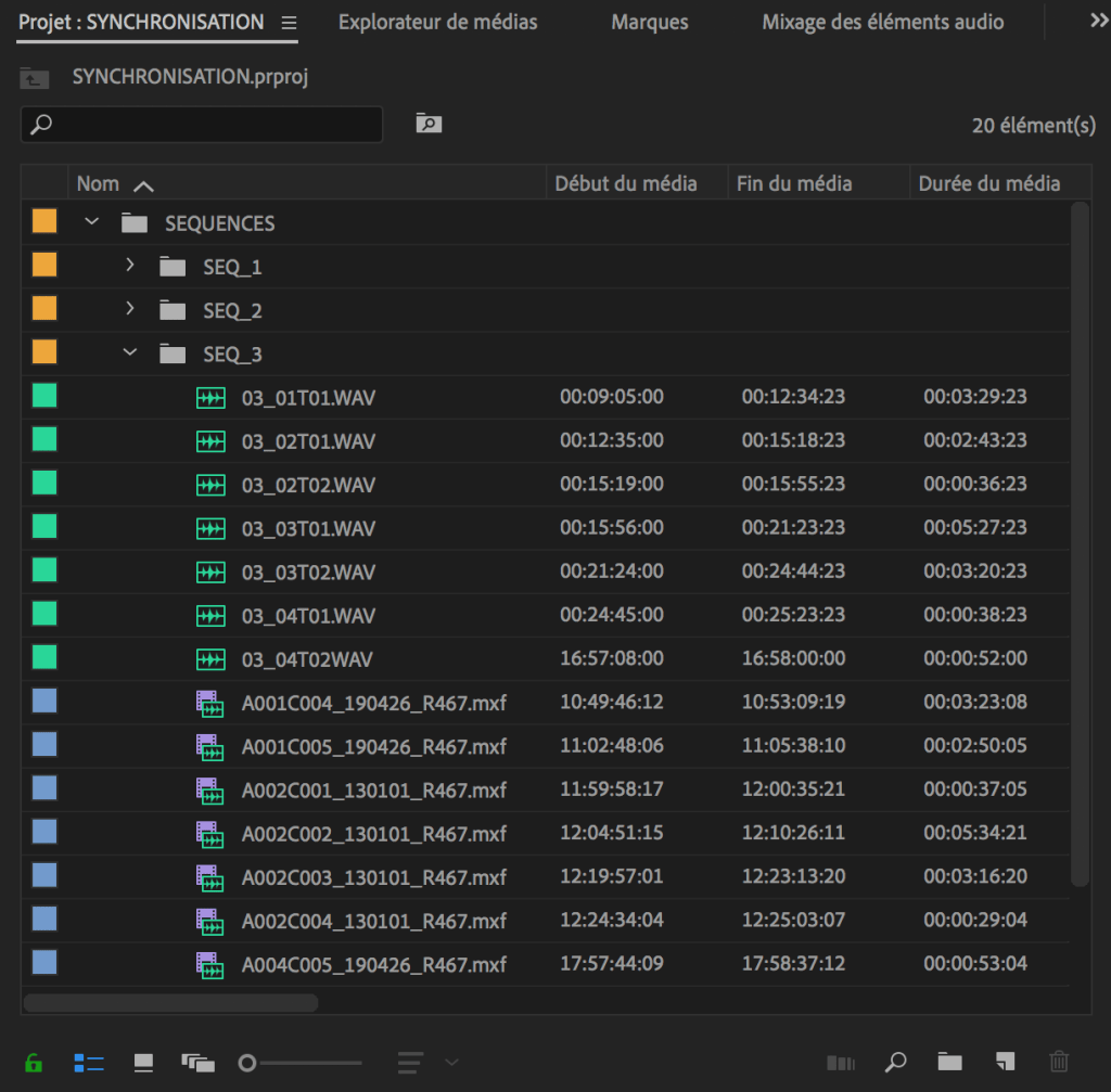 J’ai pour habitude de ranger les rushes par séquence, dans des chutiers (bins) réunissant tous les fichiers vidéo et audio de la scène.