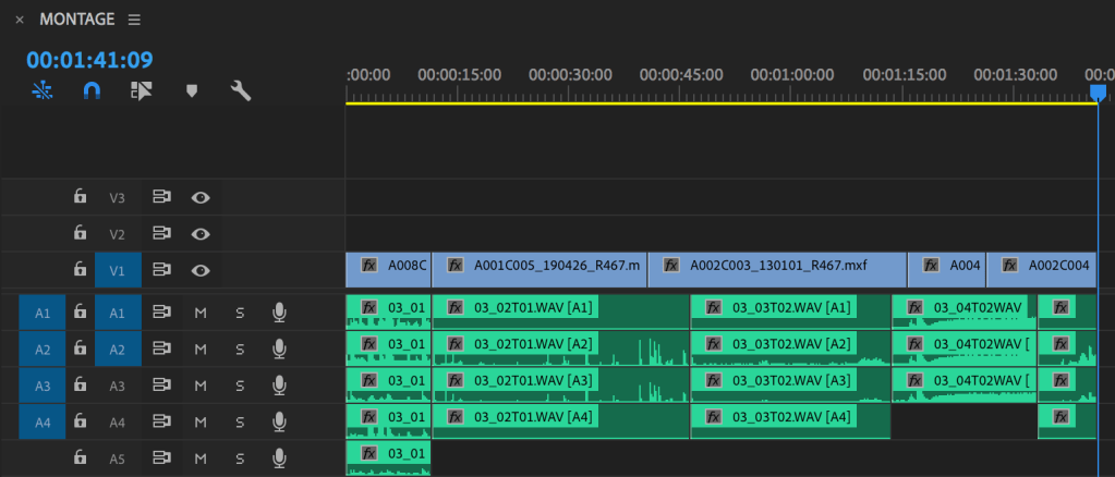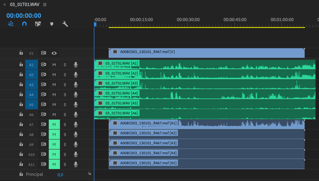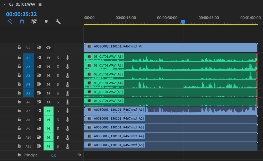 Commencez par ranger scrupuleusement vos pistes sur la timeline pour faire de la place aux multi-pistes. Par exemple, si vos fichiers audio d’origine ont 6 canaux et que vous avez monté avec 2 pistes par fichier seulement : rangez les premiers fichiers audio sur A1/A2 et les deuxièmes sur A7/A8 pour laisser la place aux 6 canaux de A1 à A6 / de A7 à A12 lors de la conformation.