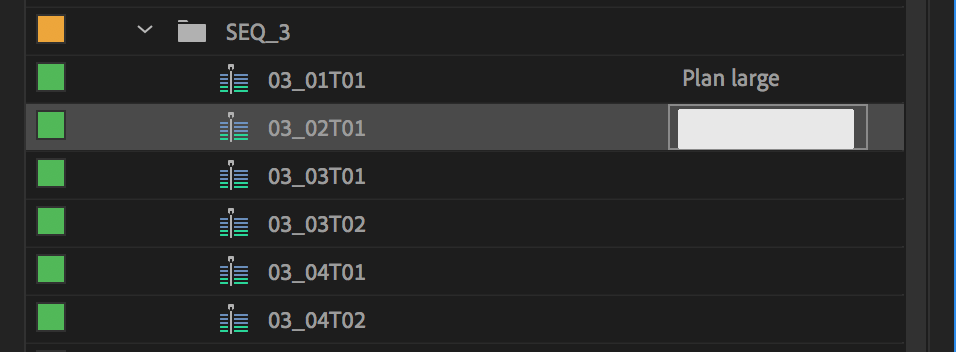 Conseil: si les fichiers audio fournis par l’ingénieur du son sont nommés par scène comme dans notre exemple (c’est rarement le cas pour les fichiers vidéo), vous pouvez choisir l’option « Nom de l’élément audio+ » à l’étape précédente. Ceci donnera aux séquences multi-caméras le nom de l’élément audio synchronisé et vous fera gagner du temps quand vous voudrez les renommer – en retirant uniquement la mention « WAV » ici par exemple. J’ai pour habitude de qualifier les plans dans l’onglet « Description » pour conserver les noms de séquences/plans/prises visibles.