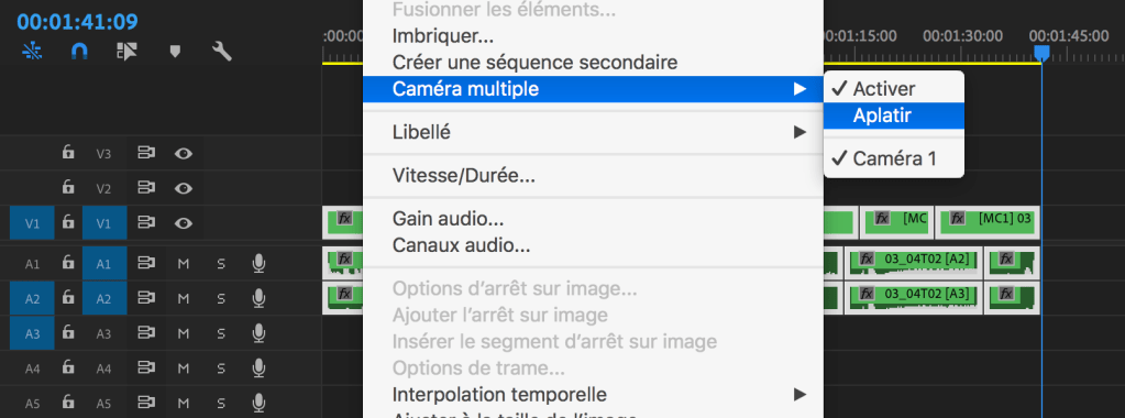 - Il est très facile de revenir aux fichiers sources en « aplatissant » les fichiers multi-caméras dans la timeline. Ceci fonctionne admirablement bien pour l’image ! Moins pour le son… Il est possible que vous ayez à prévoir une conformation manuelle de l’audio en fin de course en fonction du logiciel utilisé par le monteur son.