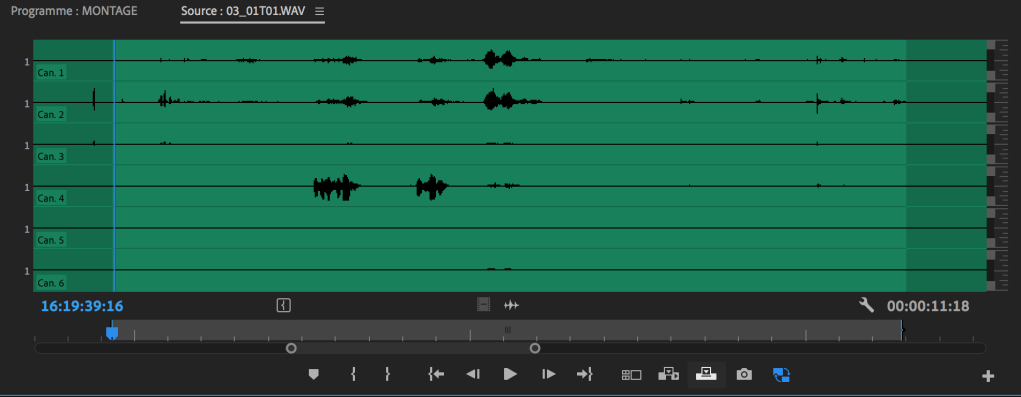 Placez la tête de lecture au début du premier fichier audio sur la timeline et faites un « match frame » (raccourci « F » par défaut). Votre fichier s’ouvre dans le moniteur, et montre bien les 6 canaux audio du fichier source.