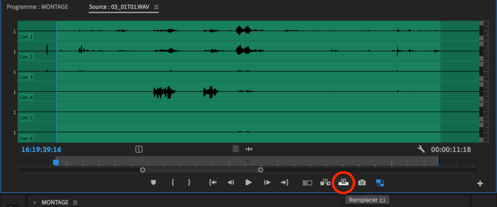 Assurez-vous que tous les canaux audio sont activés dans la timeline (A1 à A6 dans notre exemple) puis choisissez « Remplacer » (raccourci « ; » par défaut) pour remplacer les 2 pistes utilisées dans le montage par les 6 pistes du fichier source.