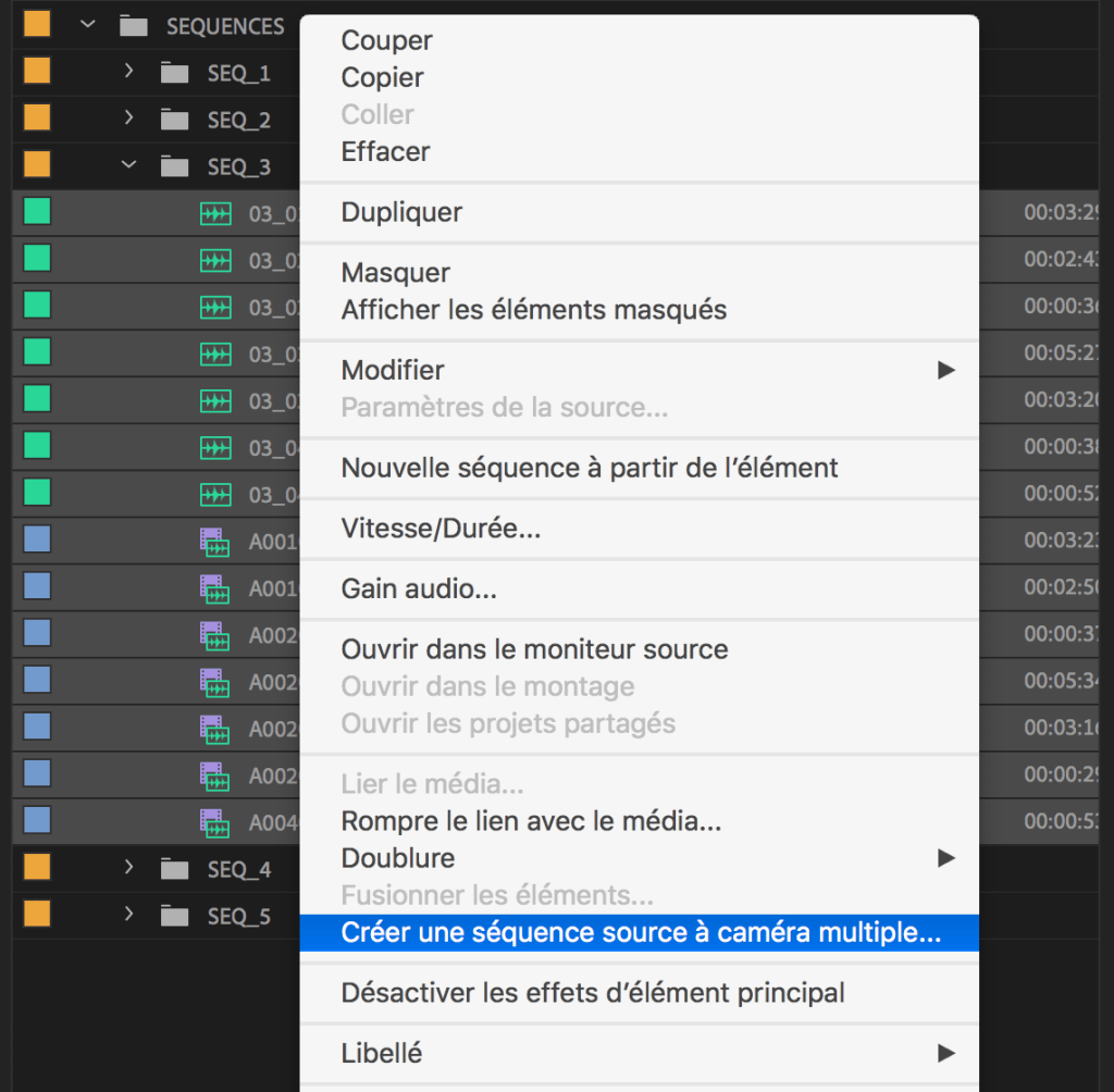 Sélectionnez tous les fichiers vidéo et audio du chutier, faites un clique-droit, et choisissez « Créer une séquence source à caméra multiple ».