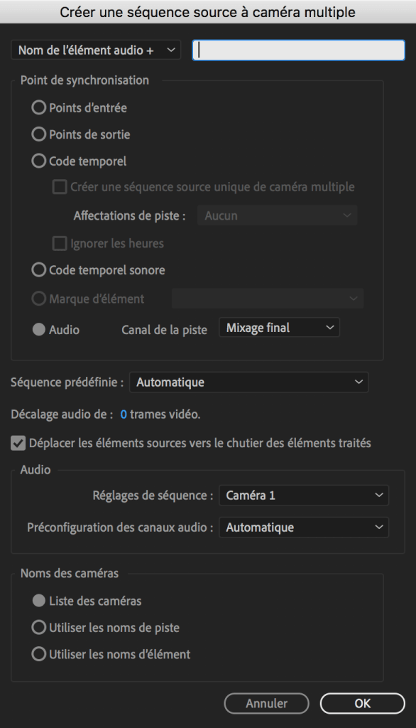 Les options de synchronisation se trouvent en haut de la fenêtre sous la dénomination « Point de synchronisation ». Si vous synchronisez via un code temporel, la synchronisation sera presque instantanée ! Si vous synchronisez par l’audio, il faut laisser le temps à Premiere de comparer le son témoin de la caméra avec les fichiers audio, mais cela est assez rapide.